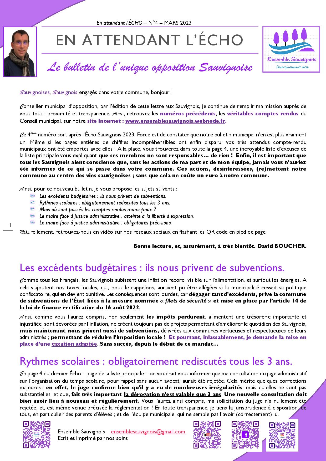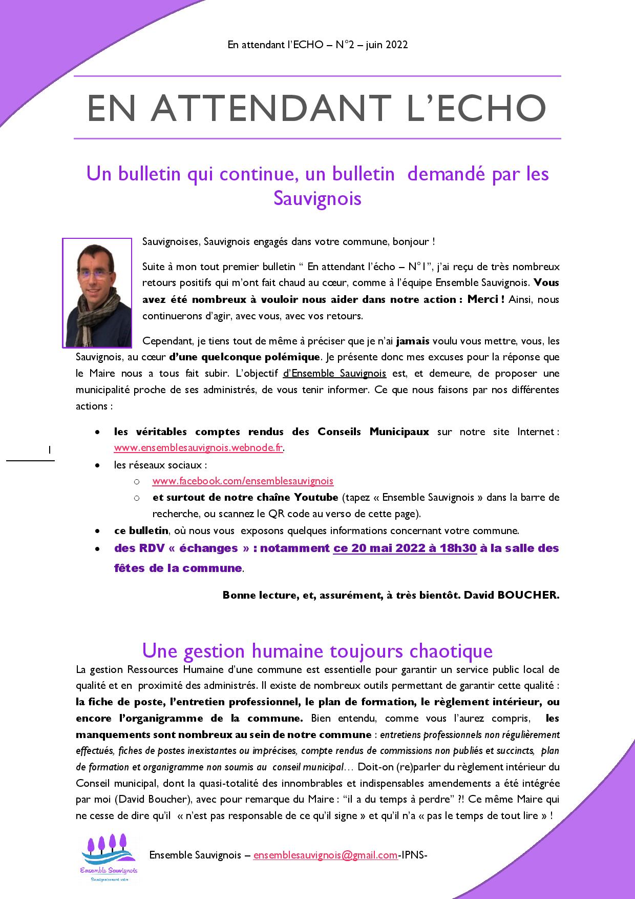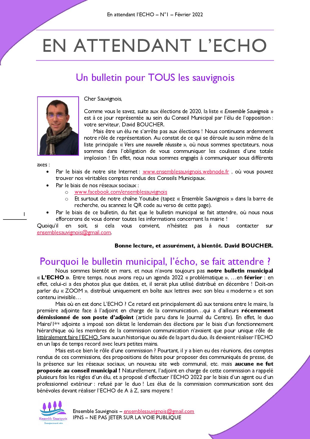 Comme vous le savez, suite aux élections de 2020, la liste « Ensemble Sauvignois ! » est, au sein du Conseil Municipal, pour ce mandat, représentée par l'élu de l'opposition : David BOUCHER.